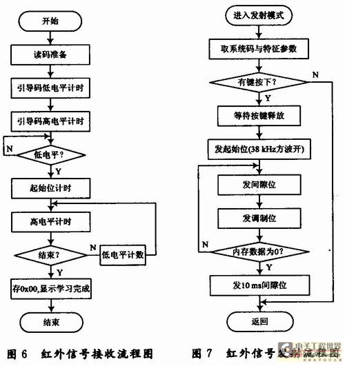 红外信号接收流程图如图6所示。接收信号波形的测量,需采用较高速主控制芯片,对原始信号的进行精密采集,同时采用了比较大的RAM作为信号的缓存。分析判别信号主要是对采集到的信号进行分析,比如对信号的发送周期、引导码电平时间、数据编码高低电平的时间、编码位数据等参数进行细致分析,判断出编码类别,提取出特征参数便于下一步的存储。