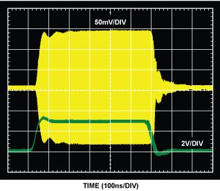 开关输出波形和TTL输入信号如图12所示。请注意,上升沿和下降沿非常陡峭。由于开关的开关时间要求相对较慢(约为50 ns),因此本应用没有使用尖峰电容C5和C6。设置稳态二极管电流的电阻R11和R12均为330 Ω。