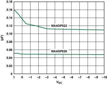 ADA4858-3为单电源系统中的互补PIN二极管微波开关驱动问题提供了一种独特的解决方案。回顾图4,从中可以看出:即使很少量的反向偏置也有助于降低二极管电容CT,具体取决于PIN二极管的类型。此类驱动器对GaAs PIN二极管很有利,因为这种二极管通常不需要很大的负偏置就能使关断电容(CT)保持较小的值(图9)。