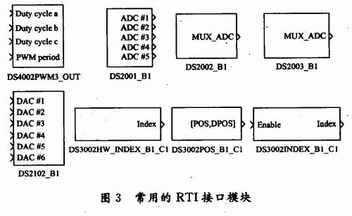 比如:在采集电机电流iA时,硬件上已经利用传感器和信号处理等电路将电流信号采集并转换成±10 V的电压信号输入到了DS2001AD采集板的ADC#1通道,此时在软件上将原来离线仿真模型中从电机仿真模型得到的电流反馈信号用DS2001_B1(见图3)的RTI接口模块替换,并进行简单的单位换算以保证最终参与运算的电流值与实际的电流值大小一致。离线仿真模型经过dSPACE的RTI模块替换之后,同时将仿真模型中的电机用实际电机代替就可以得到Matlab/Simulink实验模型。图3显示了建立Matlab/Simulink实验模型的常用的几种RTI接口模块:PWM接口RTI模块(DS4002PWM3 OUT)、编码器接口RTI模块(DS3002HW INDEX B1 C1/DS3002POS_B1_C1)、A/D接口RTI模块(DS2001_B1/DS2002_B1/DS2003_B1)和D/A接口RTI模块(DS2102_B1)等。