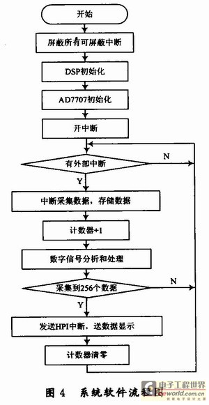 该系统软件的设计参考雷达波生命参数检测系统软件设计要求,利用TI的综合开发调试软件CCS完成软件的编写调试。软件主要完成非接触生命信号的采集、分析和处理,最后传送至液晶显示器进行显示。软件的流程如图4所示,软件一开始首先屏蔽所有可屏蔽中断,然后对DSP进行初始化,包括状态寄存器、矢量表以及MeBSP串行口的初始化,并对AD7707进行初始化。然后打开中断,等待外部中断。在中断服务程序中读取经过数模转换后的数据,并对数据进行处理、发送HPI中断,让外部MCU通过HPI接口读取数据,显示输出。