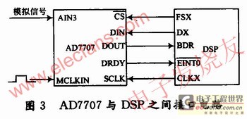 A/D转换采用高分辨率的模数转换芯片AD7707,由于其外部模拟输入信号的电压范围为±5 V,所以选择高电压模拟输入通道AIN3作为模拟信号输入端。AD7707的时钟信号由外围有源时钟芯片提供,数字信号输入端DIN直接与DSP串行数据输出端DX相连。其数字信号输出端DOUT直接与DSP的串行数据输入端BDR相连。串行时钟信号SCLK直接与DSP的串行口发送时钟信号、串行口接收时钟信号CLKX相连,如图3所示。