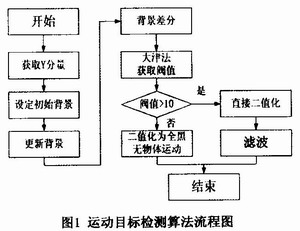 实现运动目标检测的算法很多,一般有光流法、背景差分法、相邻帧间差分法等。光流法通过求解光流方程来实现运动检测,其算法复杂、计算量大,且较难满足实时要求;而相邻帧间差分法虽然算法简单、运算量小,但抗干扰能力很差,检测效果不太理想;而背景差分法算法简单、运算量小、且抗干扰能力强,因此本文采用该方法实现运动目标检测。具体步骤如下:首先获取数字图像进行预处理,之后采用背景差分法实现运动检测,再对所得的图像用大津法进行自适应阀值分割,最后通过滤波得到检测出的运动目标。图1是本文运动目标检测的流程图。