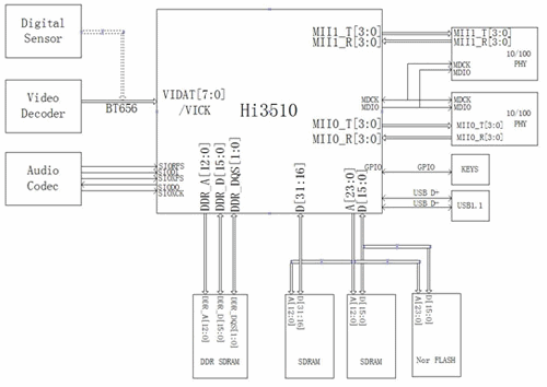 HI3510是海思公司推广的一款基于H.264 BP算法的视频压缩芯片,该芯片采用ARM+DSP+硬件加速引擎的多核高集成度的SOC构架,具备强大的视频处理功能。可实现DVD画质的实时编码性能,能自适应各种网络环境,确保画面的清晰度和实时性,低码率的H.264编码技术极大减少网络存储空间,并通过集成DES/3DES加解密硬件引擎确保网络安全。Hi3510采用0.13μm工艺、LFBGA400封装,大小为19×19mm,管脚间距为0.8mm,片内集成了包括数字视频接口、USB,ETH、I2S、I2C、GPIO、SPI、UART、SD RAM、DDR等接口,满足各种应用场景的设备开发的同时能大大降低了设备的BOM成本。