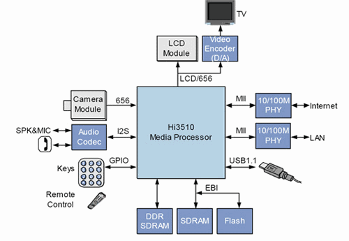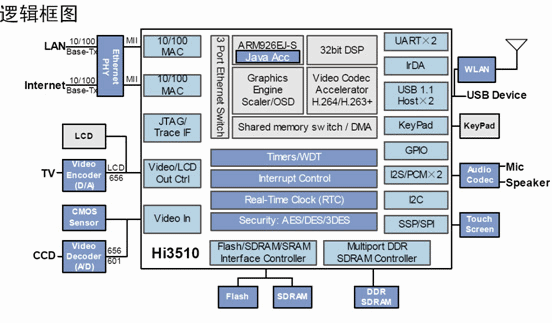 如上图所示,该芯片由ARM+DSP+Video Codec Accelerator+Graphics Engine Scaler的核心构成,集成了丰富的外围接口,并内部集成包括如数字水印、DES/3DES算法,使得单芯片能满足基本所有的工作,降低与其它芯片配合的开发难度,也免除厂家对算法等标准部分的内容进行重复开发,大大降低了设备厂家的投入门槛。配合海思不通应用形态的开发包,可以开发出PMP、可视电话、网络监控、PVR、可视对讲等各种产品。