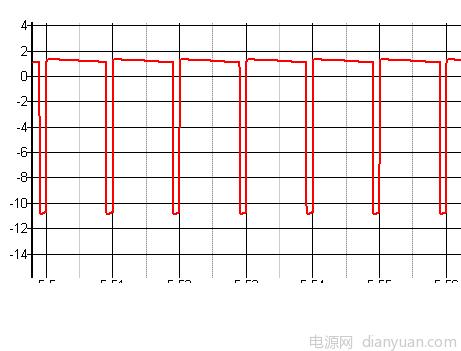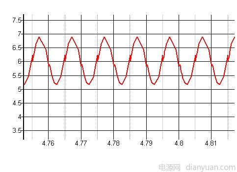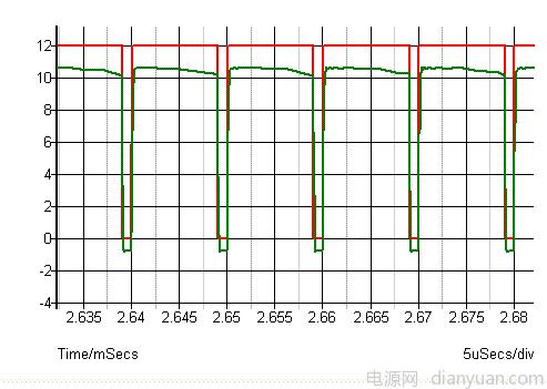 其平均电压为6V,但是峰峰值,却有2V,显然C1不够大,导致驱动信号最终不够平。那么把C1变为470n。Q1-G的电压波形就变成如下: