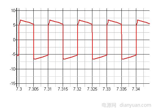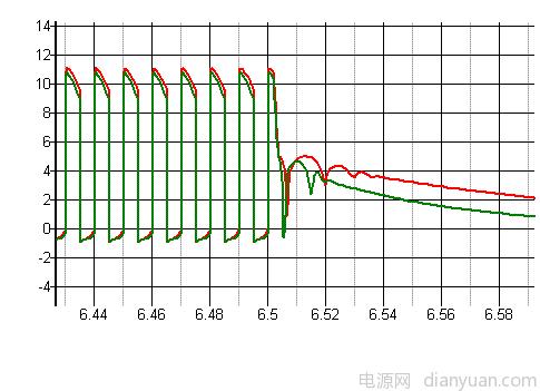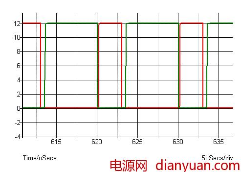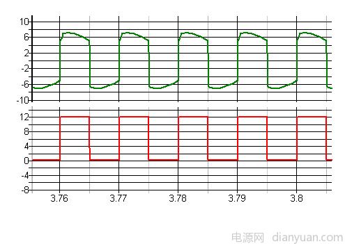 红色波形为驱动源V1的输出,绿色为Q1的G级波形。可以看到,Q1-G的波形为具有正负电压的方波,幅值6V了。