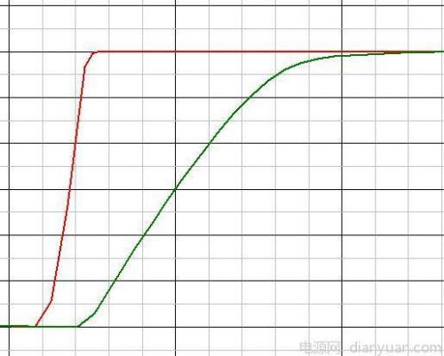 红色的是R3=1欧姆,绿色的是R3=100欧姆。可见R3越大,MOS的导通速度越慢。