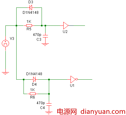 在有源钳位,不对称半桥,以及同步整流等场合,需要一对互补的驱动,那么怎么用一路驱动来产生互补驱动,并且形成死区。可用下图。