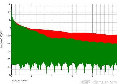 可以看到,驱动电阻增加可以降低MOS开关的时候得电压电流的变化率。比较慢的开关速度,对EMI有好处。下图是对两个不同驱动情况下,MOS的DS电压波形做付利叶分析得到