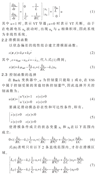 图1为Buck变换器的拓扑图,根据全控型电力电子器件的导通与否,系统具有两种工作模式,即电感电流连续模式及电流断续模式[4]。本文以电感电流工作在连续模式下,分析其工作过程。假设各电子元器件均为理想器件,取x1=iL,x2=uo,则Buck变换器的状态空间方程为: