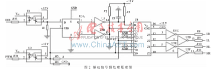 为了减少外围电路、充分利用单片机资源,采用单片机内部的脉宽调制器直接输出驱动信号(PWM),靶标转动方向信号(DIR)由单片机的I/O脚输出。为了驱动功率级,首先应对TTL电平的PWM信号和DIR信号进行预处理,电路如图2所示。