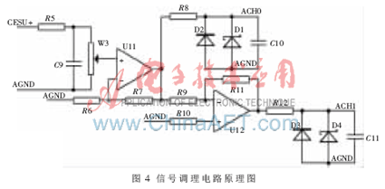 构成分压器,R5和C9组成滤波环节,U11、U12分别为同相和反相放大器,D1、D2、D3和D4起保护作用。调整W3的位置,使测速发电机在最大转速时ACH0或ACH1(分别对应正转和反转)为+5 V,同时调整放大器参数,以保证信号的线性。