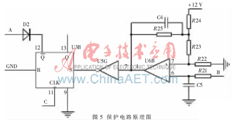 为了防止电流过大烧毁电机,设计了如图5所示的保护电路,其中R22、R23和R24分压形成比较电平,U6为比较器,U3为带清零和置1端的D触发器,A点、C点分别和图2中的A点、C点相连,B点和图3中的B点相连。在图3中,R20为取样电阻,流经电机绕组的电流越大,则B点电压(VB)越大。当VB小于比较电平时,U6输出为高电平,则U5输出为低电平,U3的12脚保持高电平,保护电路对驱动电路不起作用;当VB大于比较电平时,U6输出为低电平,经U5倒相后对U3置1,U3的12脚变为低电平,把图2中的A点拉为低电平,则LL、LR同时变为高电平,即在图3中同时关断Q2、Q7和Q4、Q8,流经电机绕组的电流变为零,电机停止转动,起到保护电机的作用。
