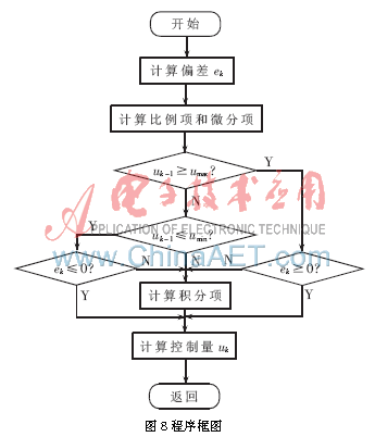 本系统中,为了消除积分饱和带来的不利影响,采用了遇限削弱积分法。具体过程是:计算uk前,先判断前一次的控制量uk-1是否超出了极限范围,如果超出,则说明已进入饱和区,这时再根据偏差的正负,来判断控制量是使系统加大超调还是减小超调。如果是减小超调,则保留积分项;否则取消积分项,程序框图如图8所示。