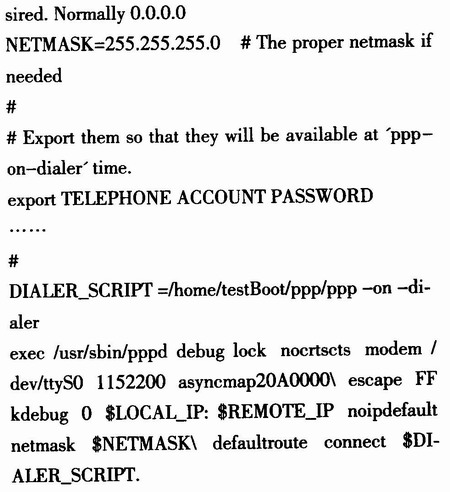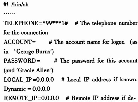 待拨号连接成功后,再由pppd建立通信链路即可。其脚本改动如下:在ppp-on里改了电话号码为*99***1#,将账号与密码清除,再修改DIALER_SCRIPT的路径,同时把下面的设备改成/dev/ttyS0,速率改为115200,再将crtscts参数去掉。同时在ppp-on-dialer里把帐号密码去掉。其改动后的脚本如下: