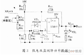 发射机控制电路内,设置有电源电压" title="电源电压">电源电压监测电路(在音频处理电路图上),一旦检测到电源电压降低,就使功率直流控制电压降低,从而使射频输出功率降低。其电路简图如图3所示。