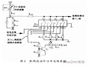 从图2可以看出,机内高温降功率控制,实质上就是将Tx(发射机)前面板功率调整电位器RP11设置的功率直流控制电压,经R168与D10某一路(或几路)开关接通所连接的电阻(R175~178)进行分压处理,使送入模拟乘法器Vx端的电压降低,从而使射频输出功率降低。