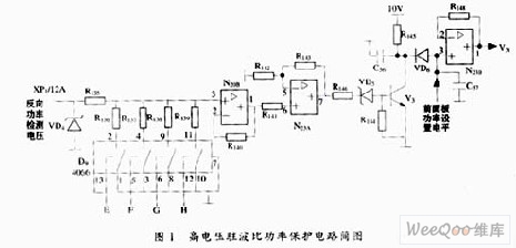 响功放级的安全。因此,发射机控制电路中设置高压驻波比保护电路,在电压驻波比高于一定值时,控制射频功率输出降低有效的保护功放电路,其电路如图1所示。