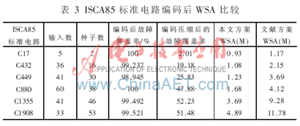 表3中第一列表示标准电路名称,第二列表示该电路的输入端口数,第三列表示本方案编码后需要存储的折叠种子个数,第四列表示本方案的故障覆盖率,第五列表示压缩后但没有经过约翰逊折叠计数器编码的各电路WSA统计值,第六列表示本方案的各电路WSA统计值,而第七列是参考文献[7]中的实验结果。通过结果的比较可以发现本方案的优越性。观察表3可发现本方案电路中产生的测试功耗大大低于参考文献[7]中的功耗值。由于本方案采用的是完全确定性测试,因此电路中的故障(除不可测故障外)均可测出,而参考文献[7]中由于采用的是伪随机测试,因此不能保证每个电路的高故障覆盖率。