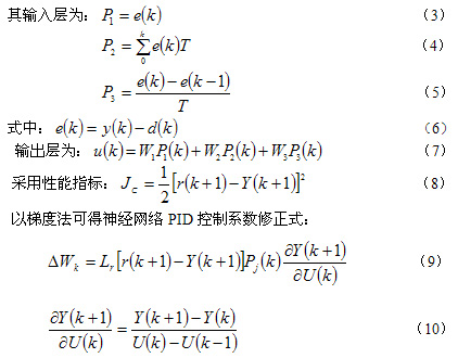 根据上式,组成由两层线性神经网络构造的控制器,如图1所示。它是由比例、积分、微分三个单元组成的一种动态前向网络,各层神经元个数、连接方式、连接权值是按PID控制规律的基本原则和已有的经验确定,能够保证系统的稳定和快速收敛。