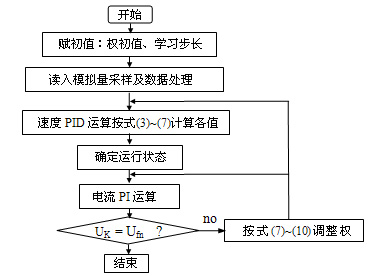 在直流双闭环调速系统中,为了提高系统响应的快速性和限流的必要性,电流内环仍然采用传统的PI调节器,而转速环则采用神经网络PID自适应控制器,以提高系统的鲁棒性。这两级相串联的PID运算都由PLC实现,我们把这一运算环节作为中断程序来处理。PLC的PID自适应控制中断处理子程序流程图如图3所示。