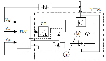 本文用PLC实现神经网络PID自适应控制,并应用于直流逻辑无环流可逆调速控制系统,使系统的控制精度达到了只有理论上才能实现的无静差。考虑到可逆调速控制系统的控制设备、器件数量多、对系统运行安全可靠提出的更高要求,采用高可靠性的PLC作为控制核心,以晶闸管为执行机构的直流调速控制系统,其系统主要由两部分构成,系统框图如图2所示。其中PLC实现神经网络PID自适应器与逻辑无环流双闭环的控制部分,长划线-点-点虚线框内为(V—M)三相桥式晶闸管—电动机系统,GT为V—M系统的晶闸管触发电路,它由硬件实现。短划线虚线框内为换向软开关,由PLC软件实现。