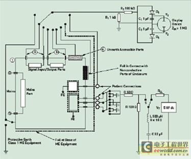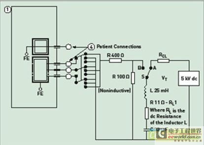 图1. 用于抗除颤型应用部件的单个病人连接的测试电压电路