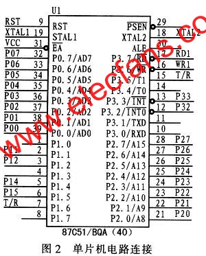 为了方便读图,该系统设计的电路原理图中的许多导线连接都采用网络标号的方法,而标号的命名基本采用引脚名称。单片机的P1端口的位操作控制Flash的控制端,P0端口作为单片机和Flash的地址和数据传输端口。其中数据的流向采用P1.6和P1.7控制,要读取Flash的数据时,如读ID时,先对单片机的P1端口位操作,依照时序设置控制字,接着由单片机的PO端口输出读取ID的命令,然后设置写地址的控制字,输入地址00H。读状态时,连续的RE脉冲可输出ID代码。页读取操作与此类似。图2为单片机电路连接图。
