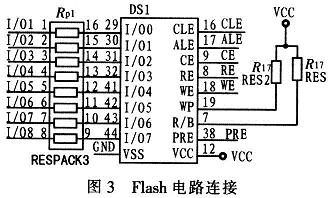 依据该Flash器件数据资料中各个引脚的功能,设计Flash的电路连接,图3只给出K9K8G08UOM部分所用引脚,电路中Flash的控制端经电平转换器后与单片机的Pl端口相连,而I/O端口经电平转换器与单片机的P0端口相连。