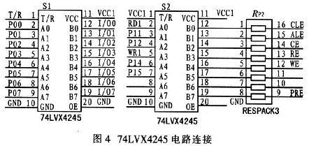 硬件电路设计由于选用的51单片机是TTL器件,而所要检测的NAND型Flash存储器是CMOS器件,这2种类型器件的电平不相匹配,因此需增加电平转换器74154245,从而实现电压的5 V与3 V的双向转换。