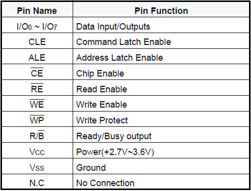 不同开发板使用的NandFlash的型号可能不一样,本文只是以K9F1208U0M为例做个简单介绍。引脚描述如下所示: