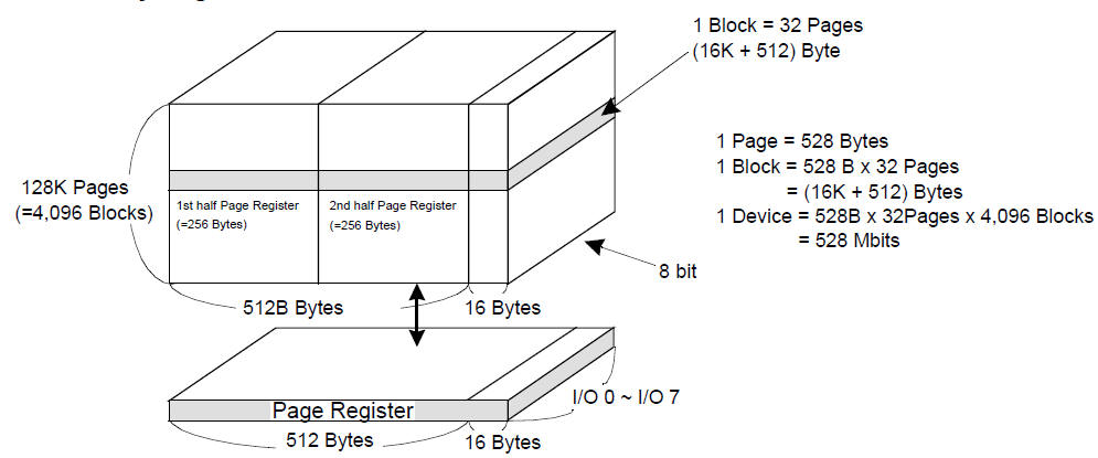 Device、Block和Page之间的关系---1 Device = 4,096 Blocks = 4096*32 Pages = 128K Pages;1 Block = 32 Page;1 Page = 528 Byte = 512 Byte + 16 Byte。其中1 Page中包含有数据寄存器512 Byte和16 Byte的备用位用于ECC校验存储。所以有528 columns * 128K rows(Pages)。1 Page中的512 Byte的数据寄存器又分为两个部分1st 256 Bytes和 2nd 256 Bytes。用于数据存储的单元有 512 Bytes * 32 Pages * 4096 Blocks = 64 MB,用于ECC校验单元有16 Bytes * 32 Pages * 4096 Blocks = 2MB 。