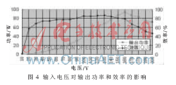 图4所示为输入电压对输出效率和功率的影响,采用的是GU50磁芯,在水中输入100 V、100 kHz电压,气隙为5 mm。