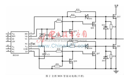本设计采用的是全桥整流电路实现高频逆变,全桥逆变效率虽然不高,但实现的逆变功率较大。为此,选用了MOSFET功率器件,能够在MOS管发热损耗较少的情况下,实现大功率的能量传输。MOS管的开关驱动电路由IR公司的驱动芯片与门级关断钳位电路组成。IR2110是IR公司推出的带自举的低成本驱动芯片,广泛应用在各种MOS管与IGBT驱动电路中,上臂自举能减少所需的驱动电源数目。门级关断钳位电路是用两级MOS管组成反相器。驱动电路的设计关键点是选择自举电容C1与上拉电阻R23。在Q13关断时C1能被快速充电,开通Q14,把Q13的栅源极电压控制在门级阈值电压以下,所以C1与R23构成的充电电路时间常数要小,以便实现快速关断,减少开关损耗。在Q13、Q15开通时,Q14始终保持在阈值电压以下,电容C1通过R23对桥的左边放电,但Q13、Q15的电平仍然要保持在高电平,所以R23的阻值要大,C1值要小,以减小由D13、R23、Q15构成的电路电流和减少自举电源的功耗。在实际电路中采取牺牲辅助电源的部分功耗,R23选取500 Ω,便能取得一个较好的效果。全桥MOS管驱动电路如图2所示。