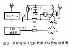 利用RX3310A可以实现无线数据的传输。图3是利用RX3310A实现单片机串口之间无线数据传输的示意图,其中右半部分为发射电路,左半部分为接收电路。发射电路由振荡电路和控制(调制)电路组成。其中Q2、L1、C2和Y1组成一个振荡电路,它的振荡或停振受Q1的控制。当Q1导通时,振荡器工作;当Q1截止时,振荡器停振。而Q1的导通与截止又受到单片机串口输出的脉冲信号的控制,也就是说:单片机的串口信号可以对振荡信号实现ASK调制,这样就可以在天线E1上发射 ASK信号。