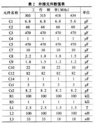 图2中外接元件的值应根据工作频率来选择,具体数值可参考表2。图2中的Ct1和Ct2为温度补偿电容,可以不接;另外L1和C1也可以用声表面谐振器来代替。