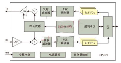 图2: BK5822射频收发器内部的系统框图
