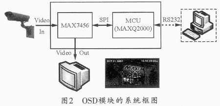 MAX7456作为OSD系统的核心部件,需要相应的外围器件的配合才能发挥自己的作用。图3所示为OSD模块的硬件结构框图。其中,MAX74 56负责对输入的模拟视频信号进行加字幕处理;MAXQ2000作为一颗低压微功耗单片机,可通过GPIO模拟SPI接口时序为MAX7456提供相应的控制信号,并负责通过串口与PC通信,以获得用户自定义的字符集和配置信息;MAX3002是一颗双向电平转换芯片,它可将MXXQ2000的2.5V系统信号转化为MAX7456可以使用的5V系统信号;MAX3311是与MAX02000配套的串口芯片,负责提供与PC通信的串口信号;MAX8881在此可将5V的供电转化为单片机和buffer芯片需要的2.5 V电源。