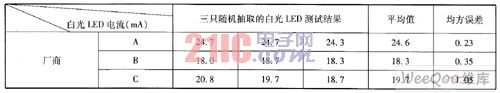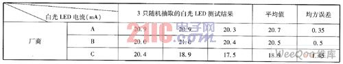 从表1中的“平均值”项可以看出,不同厂商提供的白光LED一致性较差,A厂商提供的白光LED吸取电流最大(平均为24.6mA),B厂商提供的白光LED吸取电流最小(平均为18.3mA)。不同厂商的白光LED在采用相同偏置电压、相同的限流电阻时的电流差别较大,均方误差为3.27mA。
