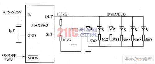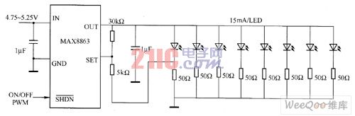 图3的电路是对图2的电路进行的改进,每只白光LED的电流为15mA,适合便携式电子设备的背光源要求。MAX8863可以驱动8只白光LED,每只白光LED的电流为15mA。当白光LED正向电压较低或限流电阻的电流低于15mA时,所允许的输入电压更低。如图3所示电路可给不同厂商、不同批次的白光LED提供较好的亮度匹配。
