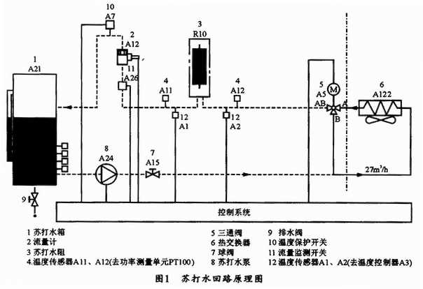 流量监测计A26,流量计A12,温控保护开关A7,然后返回到水箱A21。图2所示是TIE47-3A的假负载联锁线。其中,R10是个虚电阻,在图2中用它表示苏打水的等效水阻。