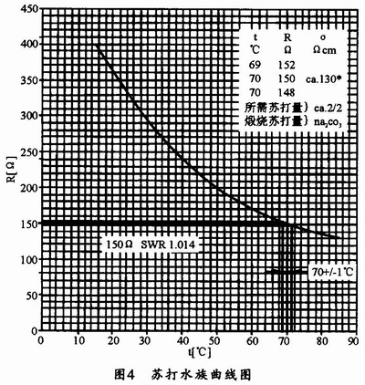 之后,再把温度调节控制开关S60设到“Open”位置,让三通阀运行在中间位置,然后把S60开关设至“OFF”位置。再调节阀门A15,把流量计A12的流量调到27 m3/h。然后再添加苏打,根据图4所示的苏打水阻曲线图设定苏打水阻值。然后采用伏安法测出苏打水阻值。测试时,可将220 V AC相线经一电流表(万用表放交流电流挡)接到假负载的一个电极上,中线接到假负载的外壳上,同时把电源地线也连到假负载的外壳上,再在电流表的输出端并一电压表(万用表交流电压档)。最后用欧姆定律(R=U/I)计算出苏打水阻值。