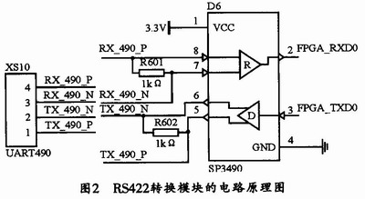 此模块采用SP3490芯片进行RS422通信协议转换。SP3490芯片Sipex的+3.3V低功率全双工收发转换芯片,完全可以满足各种规格的RS-485和RS-422串行通信协议。图2所示为RS422转换模块的电路原理图。