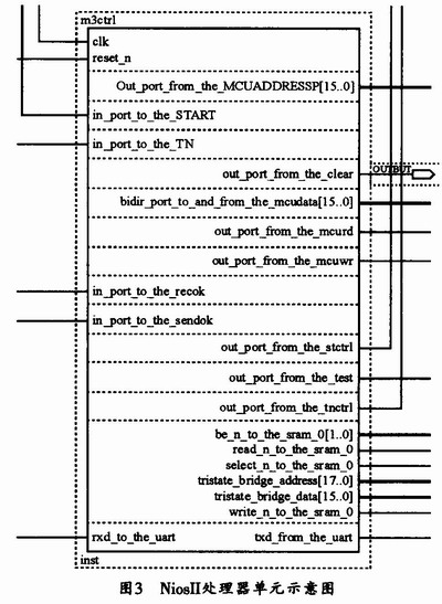 具体工作时,当数据流向为RS422串口到MIII总线时,NIOSII处理器可将数据从RS422串口接收缓冲存储器中读出,并输出至MIII总线发送缓冲单元中,同时还将数据发送到外部的SRAM中进行存储;而当数据流向为MIII总线到RS422串口时,其方式其之类似,其不同点是由于MIII总线的传输速率远大于串口的传输速率,因而要插入相应的等待和协调控制信号。