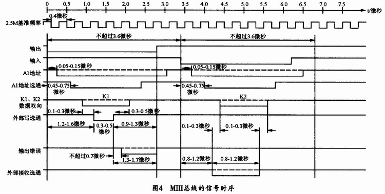 FPGA输入/输出的信号,经过以上两个步骤的电平转换,就能符合MIII总线对接设备的输入/输出信号要求。至此,只需MIII总线转换板输入/输出的地址、数据和控制信号按照MIII总线时序进行收发,就可以实现MIII总线通信。