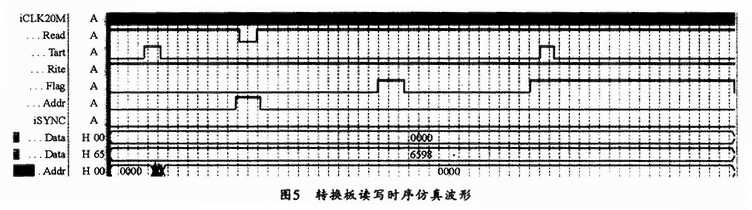 该转换板的读写时序可用VerilogHDL语言描述,然后采用有限状态机实现上述操作,并用Quartus II进行时序仿真,其仿真波形如图5所示。本文采用的是用时钟同步输出信号的Moore型状态机,该方式可有效消除状态机输出信号的毛刺。