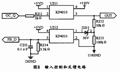 LCU输入控制电路用来控制LCU输入电压的开断,即为LCU提供逻辑输入信号。反馈电路则用于取样LCU输入逻辑信号,并将其反馈回单片机,以验证LCU的输入逻辑是否符合要求。本系统使用KP4010光电开关来控制电路的开闭。其电路如图8所示。
