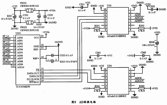 系统选用TLV2556IDW芯片作为AD转换器。TLV2556IDW是TI公司生产的12 Bit的AD转换器,它具有11路模拟电压输入通道,可编程输出数据长度等优点。为了提高系统的稳定性和AD转换的精确度,本设计同时采用ADuMl311BRWZ数据隔离芯片来在AD转换器和单片机之间进行数据隔离。设计中,4路LCU低输出分别使用了4个模拟输入端口,而14路LCU高输出则通过分时复用的方式来使用1路模拟输入端口。其AD转换电路如图9所示。