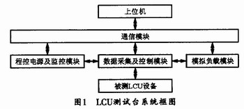 本文中的LCU测试台系统采用的是模块化设计思想,系统的主要功能模块由上位机" title="上位机">上位机、通信模块" title="通信模块">通信模块、数据采集及控制模块、程控电源" title="程控电源">程控电源及监控模块、模拟负载模块组成。其LCU测试系统框图如图l所示。